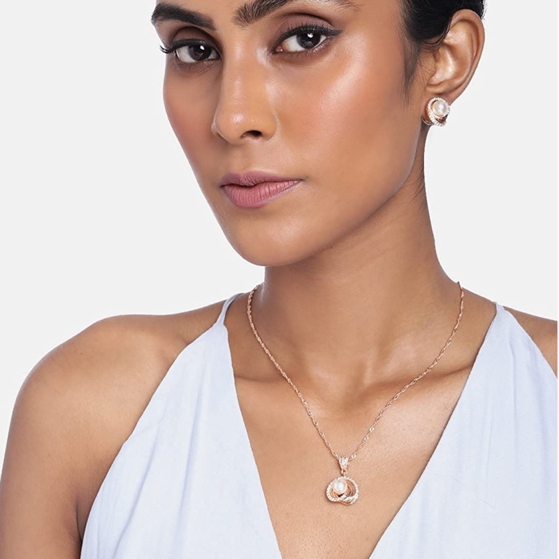 18k Rose Gold Plated Glittering Cubic Zirconia Designer Chain Pendent Necklace Jewellery Set