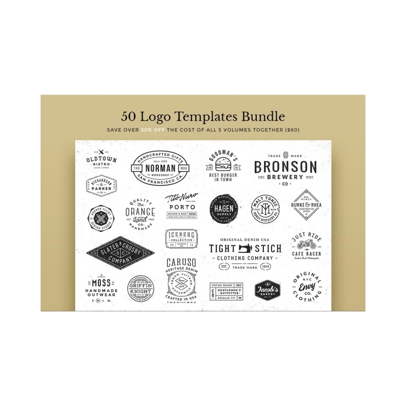 With this bundle you have a chance to get yourself all 5 logo templates packs and save over 50% off their regular price ($60). That's 50 vector logo templates that you can use for branding projects, labels, apparel design, typography pieces and more. They’re all fully editable with only free fonts included!