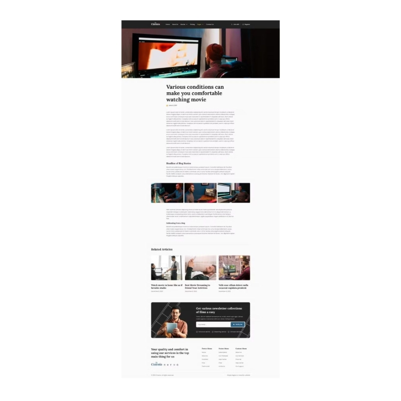 Cinemo - Video Streaming Website Elementor Template Kit is designed for video streaming agencies who want to showcase their work, services, or content. This Template Kits support responsive mobile view. This is not a WordPress theme. Template Kits contain page content for Elementor page builder. This kit has been optimized for use with the free Hello Elementor theme but may be used with most themes that support Elementor.