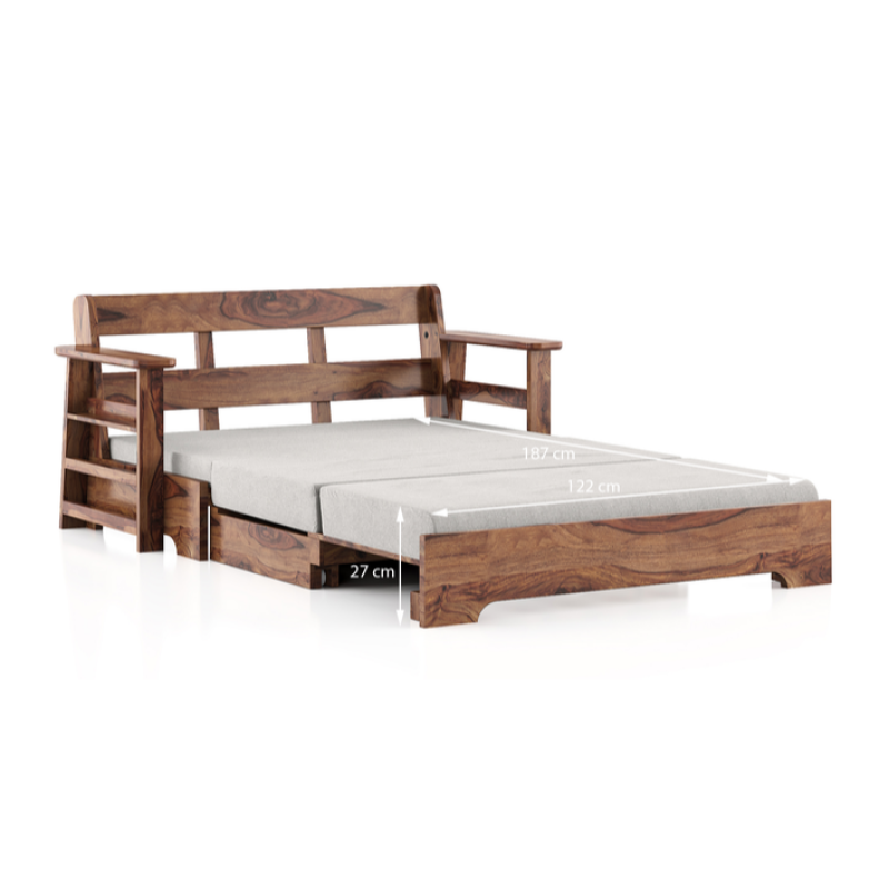 • Mix it up! The Mahim compact sofa cum bed is great at making the best of both worlds. Not only does it gorgeously combine wood and upholstery, it also turns from sofa to bed in just a few moves. So you can enjoy your binge-watching in better comfort.