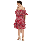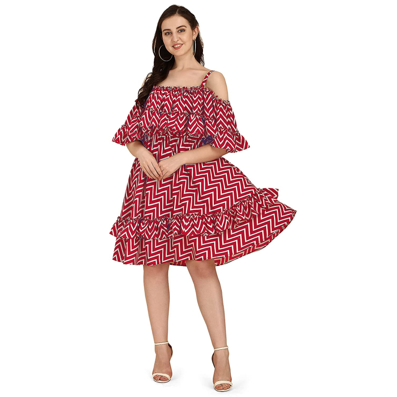 Playful pleated dress with ruffles on the hem. Off shoulder neck, with noodle straps and ruffled cape